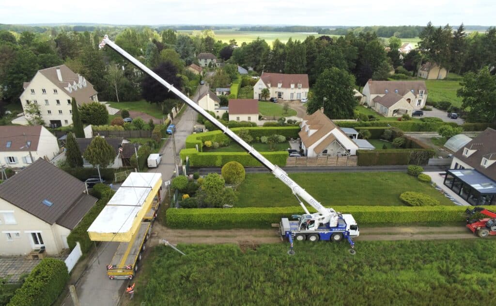Cette intervention permet d’acheminer le bassin par voie aérienne, directement jusqu’à sa zone d’implantation, en s’affranchissant des contraintes d’accès.