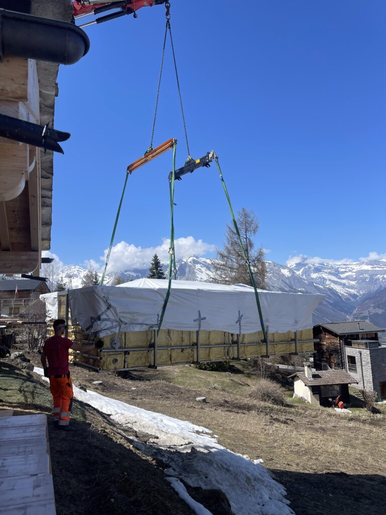 À gauche, la piscine de l’hôtel Chetzeron, transportée par hélicoptère.